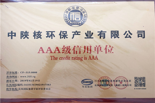 [2019-05-22]中陕核环保产业有限公司喜获多项资质荣誉近日,中陕核环保产业有限公司喜获AAA级信用等级单位、AAA级诚信经营示范单位、AAA级资信单位、AAA级重合同守信用单位、AAA级质量服务信誉单位和诚信企业家与诚信经理人等...