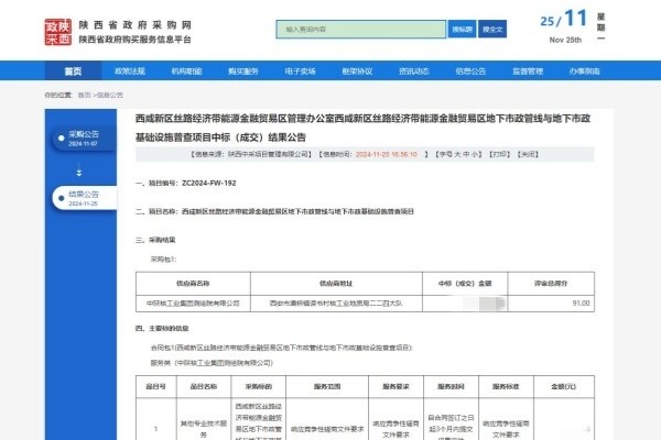 [2024-11-26]喜讯!中陕核工业集团测绘院有限公司成功中标西咸新区丝路经济带...11月25日,从陕西省政府采购网获悉,中陕核工业集团测绘院有限公司成功中标西咸新区丝路经济带能源金融贸易区地下市政管线与地下市政基础设施普查项目。本项目主要依据《城...