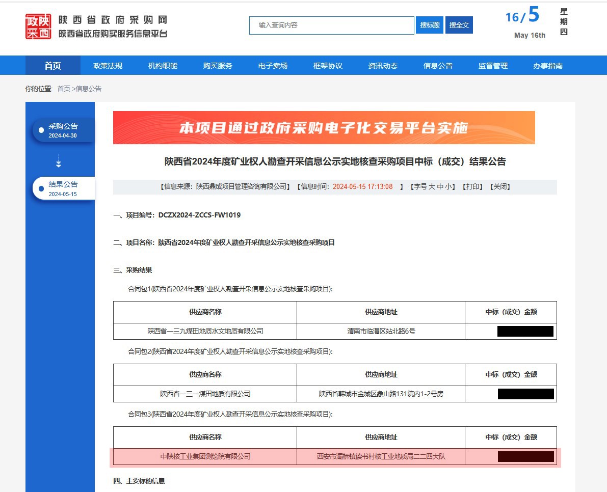 [2024-05-16]中标喜讯!中陕核工业集团测绘院有限公司成功中标“陕西省2024年...5月15日,在陕西省矿产资源调查评审中心组织实施的“陕西省2024年度矿业权人勘查开采信息公示实地核查采购项目”招标活动中,中陕核工业集团测绘院有限公司成功中标3标段。...