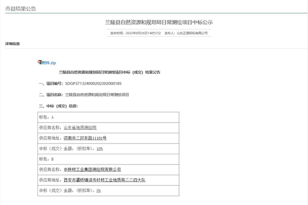 [2022-08-26]测绘院中标“兰陵县自然资源和规划局日常测绘项目B标段”近日,在兰陵县自然资源和规划局组织实施的“兰陵县自然资源和规划局日常测绘项目”招标活动中,测绘院凭借良好的信誉、优秀的技术方案、完善的服务体系及合理的报价赢得了...