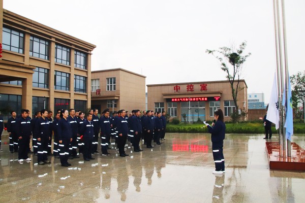 上午7时10分,钼业公司干部职工冒雨齐聚办公楼广场,满怀憧憬和激动之情等待升旗仪式。在秋雨绵绵中,四名护旗手迈着铿锵有力的步伐,将国旗护卫在旗杆下。“升国旗,奏唱国歌”,伴随着嘹亮的国歌声,五星红旗缓缓升起。