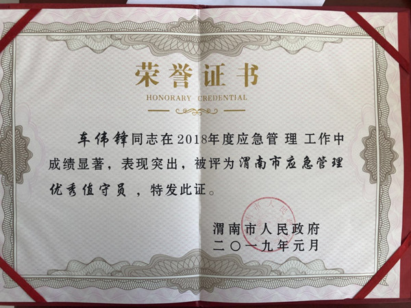 1月7日,渭南市人民政府正式授予中陕核钼业有限公司“2018年度渭南市应急管理先进单位”,同时,生产技术部部长车伟峰荣获“渭南市应急管理优秀值守员”荣誉称号,安全环保部部长李飞龙荣获“渭南市应急管理先进工作者”荣誉称号。