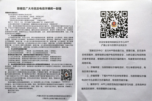 物业管理中心职工向小区居民发放“致辖区广大市民反电信诈骗的一封信”宣传资料,耐心讲解国家政策,引导居民提高个人安全防范意识,提高警惕,预防和打击电信(网络)诈骗;向大家宣传安装“国家反诈中心APP”的好处及重要意义,讲解示范“国家反诈中心APP”的安装下载、使用方法及功能,对于一些中老年人还会手把手协助其完成软件的下载、注册,让大家能够尽快了解和掌握使用方法;在小区的宣传栏等处张贴“国家反诈中心APP”下载二维码,方便居民下载,进一步宣传推广,为反电信诈骗和法治宣传工作打下良好基础。